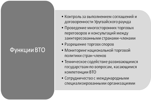 Схема 2. Функции ВТО 1.2 Этапы и ход присоединения России к ВТО В середине 1992 г. Российская Федерация получила статус наблюдателя в Генеральном соглашении по тарифам и торговле (ГАТТ), который формально унаследовала от бывшего СССР. Процесс присоединения России к ГАТТ в качестве полноправного члена был начат в 1992 г. В соответствии с постановлением Правительства Российской Федерации от 18 мая 1992 г. № 328 «О развитии отношений между Российской Федерации и Генеральным соглашением по тарифам и торговле». В июне 1993 г. Президент Российской Федерации Б.Н. Ельцин вручил А. Дункелю, являвшемуся в то время Генеральным директором ГАТТ, официальное заявление Правительства России о намерении присоединиться к ГАТТ в качестве полноправного участника. Этот шаг явился отправной точкой начала процесса присоединения России к этой влиятельной международной торговой организации. Передача в Секретариат ГАТТ в феврале 1994 г. Меморандума о внешнеторговом режиме Российской Федерации стала первым практическим шагом в процессе присоединения России к ГАТТ. В связи с образованием 1 января 1995 г. Всемирной торговой организации, включающей Генеральное соглашение по тарифам и торговле в качестве своей составной части, в декабре 1994 г. Бывший Заместитель Председателя Правительства Российской Федерации О. Д. Давыдов передал официальное заявление Правительства Российской Федерации о присоединении России к Всемирной торговой организации (ВТО). В целях координации деятельности по присоединению в 1993 г. Была образована Межведомственная комиссия (МВК) по ГАТТ. В связи с изменением институционального статуса ГАТТ и возникновением ВТО, необходимостью выработки консолидированной переговорной позиции этот орган был преобразован в 1997 г. В Комиссию Правительства Российской Федерации по вопросам ВТО. Руководителем Российской правительственной делегации на переговорах по присоединению России к ВТО в начале 2001 г. Был утвержден заместитель Министра экономического развития и торговли М.Ю. Медведков. В состав Правительственной Комиссии по ВТО в настоящее время входят около 50 федеральных министерств, ведомств и организаций Российской Федерации. Координирует деятельность Комиссии Министерство экономического развития и торговли. В соответствии с установленной процедурой присоединения, которая сформировалась в ГАТТ/ВТО за полвека существования, Россия начала сложный и относительно долгий путь по оформлению членства в этой влиятельной международной организации. В соответствии с установленной процедурой первый, т. е. «информационный», этап процесса присоединения проходит в рамках рабочей группы, состоящей из стран-членов ВТО (в нашей группе их около 60, включая всех ведущих торговых партнеров), поэтому переговоры носят многосторонний характер. Рабочая группа по России была создана Советом представителей ГАТТ в июне 1993 г. Главной задачей Рабочей группы (РГ) является детальное рассмотрение экономической политики и внешнеторгового режима России на предмет их соответствия нормам и правилам ВТО. Итогом деятельности Рабочей группы является подготовка Доклада РГ, который фактически составит основу проекта Протокола о присоединении России (как и других стран) к ВТО, в котором содержатся будущие права и обязательства страны – соискателя. Все заседания Рабочей гру