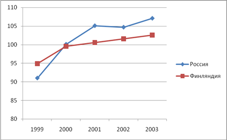 Рис. 1.Валовой внутренний продукт в России и Финляндии (в постоянных ценах, в % к предыдущему году) Вывод: В 1999 году ВВП Финляндии превосходит ВВП России, однако в 2000 году наблюдается рост валового продукта в обеих странах и с 2000 года объем ВВП России (100,1%) превышает объем ВВП Финляндии (99,6%). На протяжении остальных представленных периодов (2001-2003) ВВП России значительно превышает тот же показатель в Финляндии, но в целом в обеих странах наблюдается рост валового внутреннего продукта, что свидетельствует о схожей динамике развития стран.