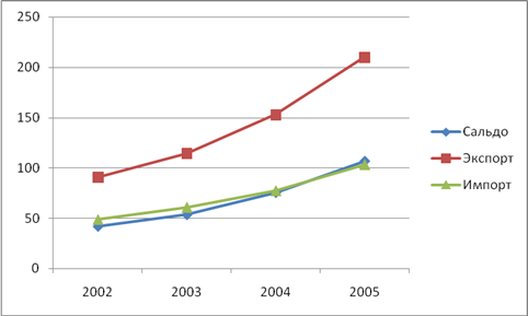 Рис. 2. Промышленная продукция в России и Финляндии (в постоянных ценах, в % к предыдущему году) Вывод: С 1999 по 2000 года объем промышленной продукции и в России, и в Финляндии увеличивается, причем имея при этом одинаковый темп роста. Однако с 2000 года динамика изменения промышленной продукции в России (99,9%) выше, чем в Финляндии (99,1%). К 2002 году в России наблюдается небольшой спад развития отрасли по сравнению с 2001 годом на 8%, а в Финляндии наоборот, увеличение. Но с 2002 года темпы роста промышленной продукции в России опять превышают темпы роста в Финляндии, что связано с тем, что Россия пытается добиться высоких показателей во всех отраслях экономики. 2. По данным таблицы 3 представить графически динамику показателей, характеризующих внешнюю торговлю России за 2002 – 2006гг. Сделать выводы о характере изменений. Таблица 4 Основные показатели, характеризующие внешнюю торговлю России (млн. долларов США)