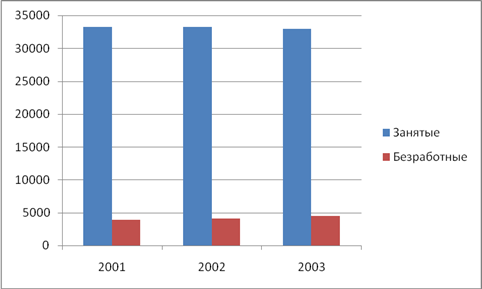 1. Рассчитаем численность экономически активного населения (часть населения, которая предлагает свой труд для производства товаров и услуг) ЭАН2001 = (3858*100)/10,4 = 37096 тыс. чел. ЭАН2002 = (4071*100)/10,9 = 37349 тыс. чел. ЭАН2003 = (4495*100)/12,0 = 37458 тыс. чел. 2. Рассчитаем численность занятых (активная часть трудовых ресурсов, задействованная в общественном производстве) ЧЗ2001 = 37096 - 3858 = 33238 тыс. чел. ЧЗ2002 = 37349 - 4071 = 33278 тыс. чел. ЧЗ2003 = 37458 – 4495 = 32963 тыс. чел.