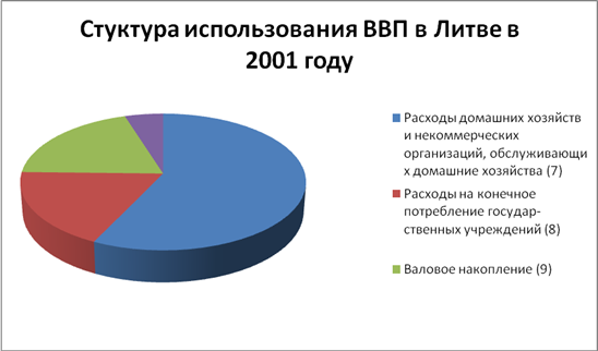 Рис. 8 Структура использования ВВП в Литве в 2001 году Вывод: В отраслевой структуре ВВП первые позиции занимают прочие отрасли, промышленность, торговля и общественное питание. В структуре потребления ВВП в Литве преобладают расходы домашних хозяйств и некоммерческих организаций и расходы на конечное потребление государственных учреждений. Список литературы 1. Антонова И. В. Словарь по мировой экономике: учеб. пособие – изд. 2-е, испр. и доп. – Тюмень, ТюмГАСА, 2004. – 60 с. 2. Бахрах Д.Н. Таможенное право России, 2005., стр. 26-28 3. Булатова А. С. Мировая экономика: учебник – М.: Юристь, 2002. – 734 с. 4. Винод Т., Нэш Д. Внешнеторговая политика: опыт реформ. М.: ИНФРА-М, 1986 г. , стр. 178-190 5. Миклашевская Н. А., Холопов А. В. Международная экономика: учебник- 2-е изд., доп. – М.: «Дело и Сервис», 2000. – 304 с. 6. Суэтин А. А. Международные валютно-финансовые отношения: учебник – 2-е изд., испр. и доп. – М.: КНОРУС, 2005. – 288с. 7. Холопов А. «Внешнеторговая политика: нетарифные методы регулирования международной торговли»// МЭМО., № 12. ,1997. 8. http://vazhno.ru/vazhnonews/article_2004_5_20_N2_85095853.html 9. http:vicipedia.ru |