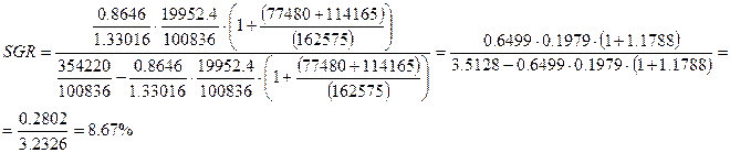 Такое расширение деятельности с точки зрения влияния на уровень самофинансирования предприятия в дальнейшем, его финансовой устойчивости и рентабельности нецелесообразно, так как оно стало очень сильно зависеть от заемного капитала и потеряло некоторую долю маневренности и ликвидности. Сейчас оно будет работать лишь на погашение банковской ссуды. Рассчитаем какой темп экономического роста ожидает АО «Интерсвязь» при самофинансировании, используя модель устойчивого состояния при определении уровня достижимого роста: