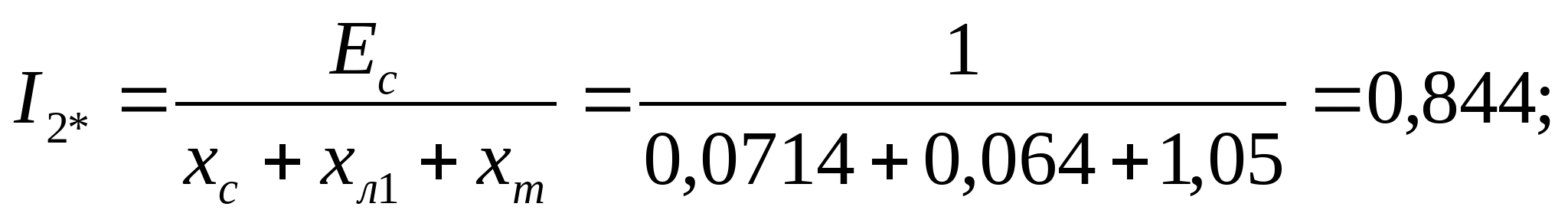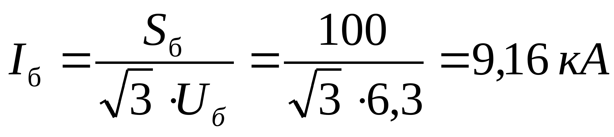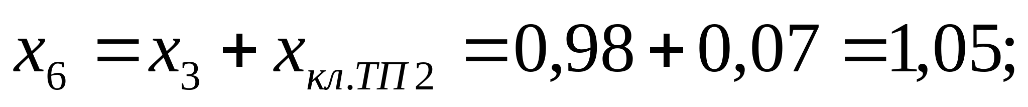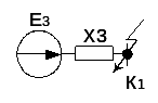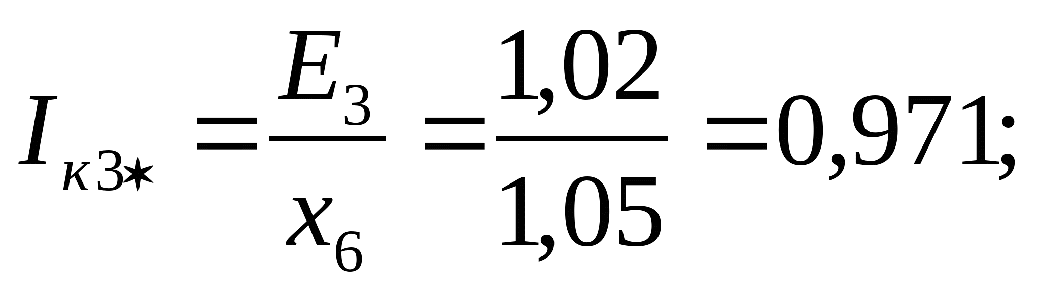 Расчет токов короткого замыкания производим для точек: 1. К1 с учетом подпитки двигателей. 2. На каждом РП. 3. На самом удаленном радиальном присоединении. 4. На самом удаленном магистральном присоединении. Расчет токов к.з для радиального варианта схемы электроснабжения. Ec=1; xcист=0,0625; xл=0,059; xт=0,67; x”сд=0,2; Ecд=1,1; Еад=1,1 Рисунок 9 – Схема замещения для 1-го варианта Выбираются базисные условия: Sб = 100 МВА; Uб = 6,3 кВ; Определяются параметры схемы: КЗ в т. К1: Рисунок 10 – Преобразованная схема Рисунок 11 – Преобразованная схема Iк1 = Iк1* ∙ Iб = 1,038 ∙ 9,16 = 9,508 кА; КЗ в т. К2 Iк2 = 1,002 ∙ 9,16 = 9,178 кА; КЗ в т. К3 Iк3 = 0,971 ∙ 9,16 = 8,894 кА; Расчет токов к.з для смешанного варианта схемы электроснабжения. Рисунок 12 - Схема замещения для 2-го варианта КЗ в т. К4 Iк4 = 0,971 ∙ 9,16 = 8,894 кА; Проверка выбранного сечения на термическую стойкость определяется по условию: Fт ≤ Fр (81) где Fт – термически устойчивое сечение где Принимаем ближайшее меньшее сечение 95 мм2 как термически стойкое. Окончательно принимается кабель 2ААБл - 6 - 3х95 Последующий расчет аналогичен. Сведем его в таблицы 11 и 12. Таблица 11 – Расчет окончательного сечения для радиальной схемы