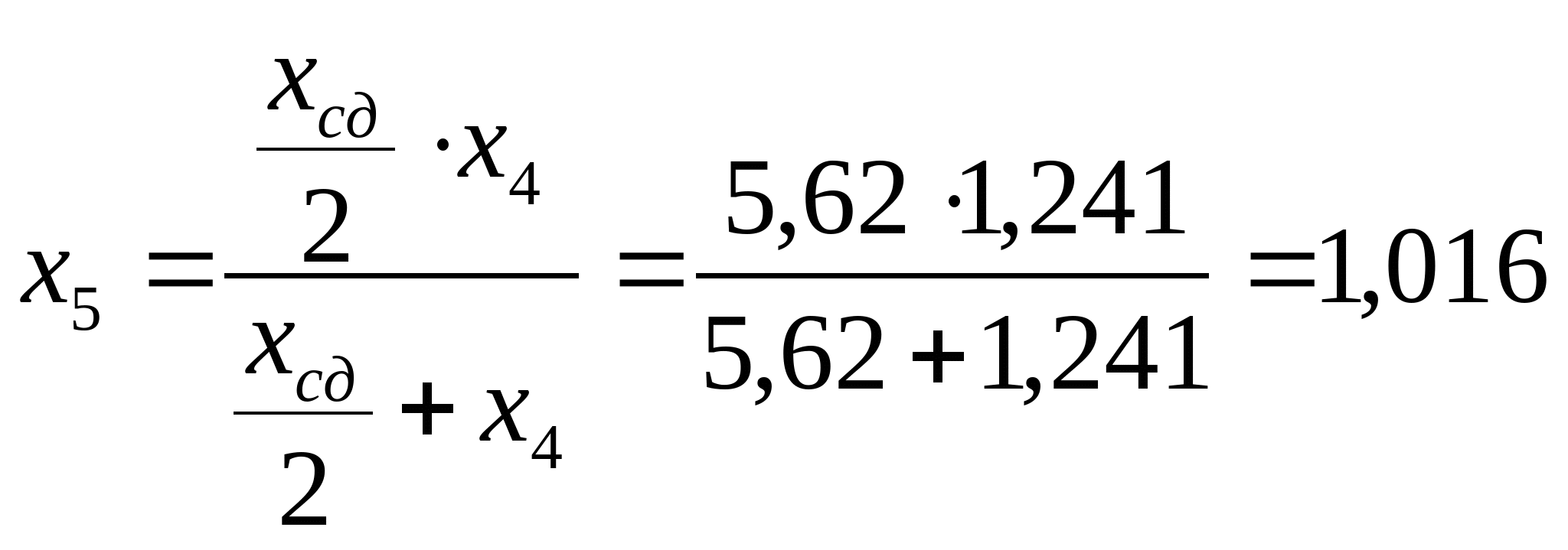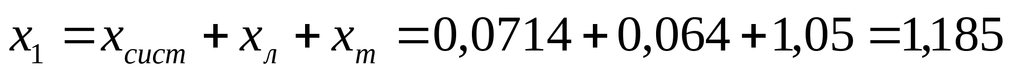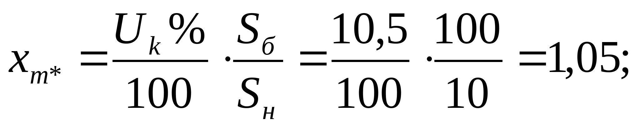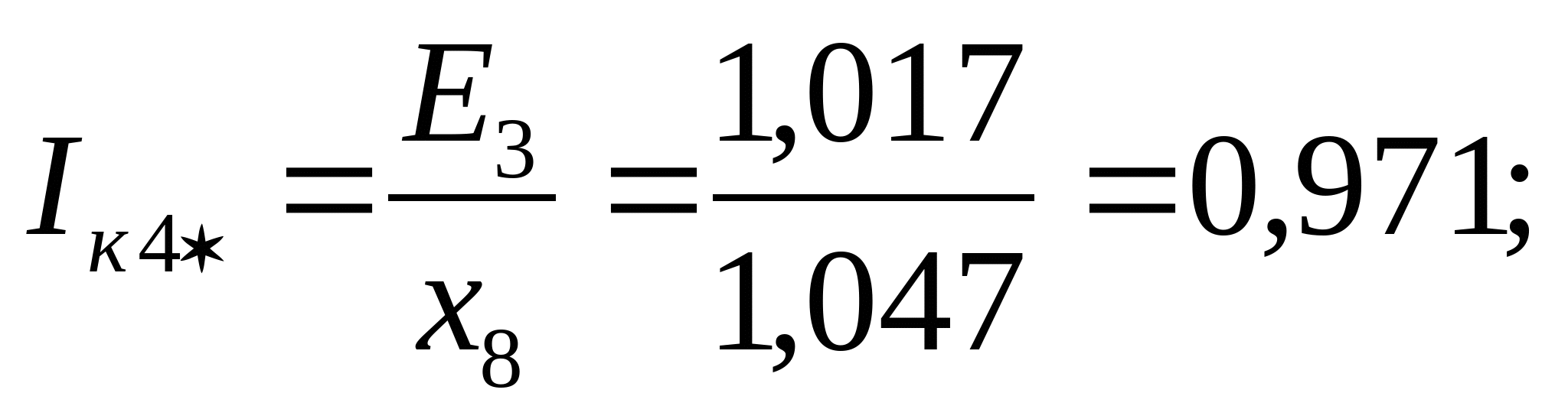 Расчет токов короткого замыкания производим для точек: 1. К1 с учетом подпитки двигателей. 2. На каждом РП. 3. На самом удаленном радиальном присоединении. 4. На самом удаленном магистральном присоединении. Расчет токов к.з для радиального варианта схемы электроснабжения. Ec=1; xcист=0,0625; xл=0,059; xт=0,67; x”сд=0,2; Ecд=1,1; Еад=1,1 Рисунок 9 – Схема замещения для 1-го варианта Выбираются базисные условия: Sб = 100 МВА; Uб = 6,3 кВ; Определяются параметры схемы: КЗ в т. К1: Рисунок 10 – Преобразованная схема Рисунок 11 – Преобразованная схема Iк1 = Iк1* ∙ Iб = 1,038 ∙ 9,16 = 9,508 кА; КЗ в т. К2 Iк2 = 1,002 ∙ 9,16 = 9,178 кА; КЗ в т. К3 Iк3 = 0,971 ∙ 9,16 = 8,894 кА; Расчет токов к.з для смешанного варианта схемы электроснабжения. Рисунок 12 - Схема замещения для 2-го варианта КЗ в т. К4 Iк4 = 0,971 ∙ 9,16 = 8,894 кА; Проверка выбранного сечения на термическую стойкость определяется по условию: Fт ≤ Fр (81) где Fт – термически устойчивое сечение где Принимаем ближайшее меньшее сечение 95 мм2 как термически стойкое. Окончательно принимается кабель 2ААБл - 6 - 3х95 Последующий расчет аналогичен. Сведем его в таблицы 11 и 12. Таблица 11 – Расчет окончательного сечения для радиальной схемы