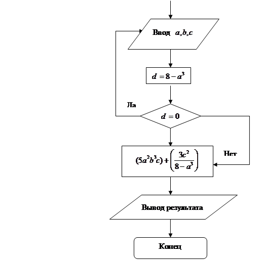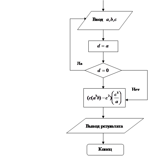 Рис. 1. Алгоритм вычисления 1.1.1 Программа, составленная с присвоением значений переменным 10 a = 6: b = 4: с = 3 20 в = a 30 IF в = 0 GOTO 60 40 END 50 PRINT (c * (a ^ 3 * b) - c ^ 2) * (c ^ 3 / a) 60 PRINT "а не должно быть 0" 70 GOTO 10 1.1.2 Программа, работающая в диалоговом режиме 10 INPUT "Введитеa,b,c"; a, b, c 20 в = a 30 IF в = 0 GOTO 60 40 END 50 PRINT (c * (a ^ 3 * b) - c ^ 2) * (c ^ 3 / a) 60 PRINT "а не должно быть 0" 70 GOTO 10 Результат: 11623,5 1.2 Найти значение выражения