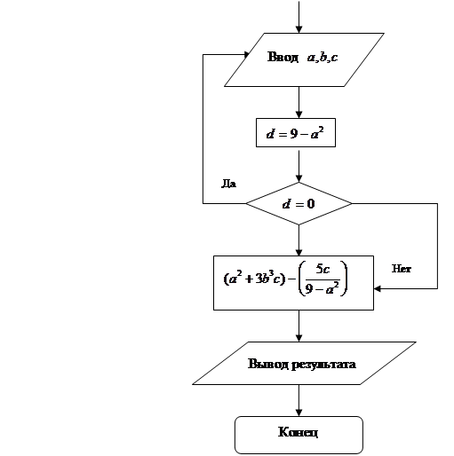 Рис.2. Алгоритм вычисления 1.2.1 Программа, составленная с присвоением значений переменным 10 a = 6: b = 4: с = 3 20 в = 9 – a^2 30 IF в = 0 GOTO 60 40 END 50 PRINT (a^2 + 3 * b ^ 3 * c) – (5 * c / (9 – a^2)) 60 PRINT "а не должно быть 3 или -3" 70 GOTO 10 1.2.2 Программа, работающая в диалоговом режиме 10 INPUT "Введитеa,b,c"; a, b, c 20 в = 9 – a^2 30 IF в = 0 GOTO 60 40 END 50 PRINT (a^2 + 3 * b ^ 3 * c) – (5 * c / (9 – a^2)) 60 PRINT "а не должно быть 3 или -3" 70 GOTO 10 Результат: 612,5555