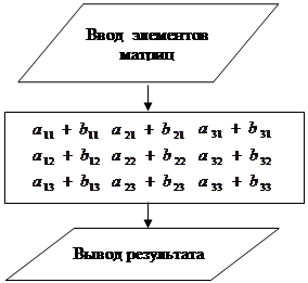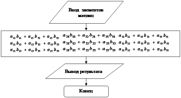 Рис.4. Алгоритм вычисления Программа нахождения суммы двух матриц CLS PRINT BBЕDИTЕ(A) INPUT "BBЕDИTЕ a11,a12,a13"; a11, a12, a13 INPUT "BBЕDИTЕ a21,a22,a23"; a21, a22, a23 INPUT "BBЕDИTЕ a31,a32,a33"; a31, a32, a33 CLS PRINT BBЕDИTЕ(B) INPUT "BBЕDИTЕ b11,b12,b13"; b11, b12, b13 INPUT "BBЕDИTЕ b21,b22,b23"; b21, b22, b23 INPUT "BBЕDИTЕ b31,b32,b33"; b31, b32, b33 CLS PRINT a11 + b11; a12 + b12; a13 + b13 PRINT a21 + b21; a22 + b22; a23 + b23 PRINT a31 + b31; a32 + b32; a33 + b33 END Результат: 2.1.2 Найти произведение двух матриц