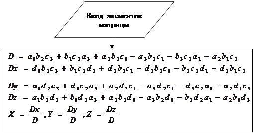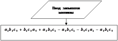 Рис.6. Алгоритм вычисления Программа вычисления определителя PRINTBBЕDИTЕ(A) INPUT "BBЕDИTЕ a1,b1,c1"; a1, b1, c1 INPUT "BBЕDИTЕ a2,b2,c2"; a2, b2, c2 INPUT "BBЕDИTЕ a3,b3,c3"; a3, b3, c3 PRINT a1 * b2 * c3 + b1 * c2 * a3 + a2 * b3 * c1 - a3 * b2 * c1 - b3 * c2 * a1 - a2 * b1 * c3 Результат: -163 2.1.4 Решить систему уравнений по формулам Крамера