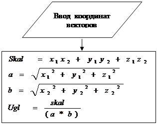 Рис.7. Алгоритм вычисления Программа решения системы уравнений по формулам Крамера 10 INPUT "BBЕDИTЕ KОЭФФИЦИЕHTЫ ПЕРВОГО УРАВНЕНИЯ"; a1, b1, c1, d1 20 INPUT "BBЕДИTЕ КОЭФФИЦИЕНТЫ ВТОРОГО УРАВНЕНИЯ"; a2, b2, c2, d2 30 INPUT "BBЕДИТЕ КОЭФФИЦИЕНТЫ ТРЕТЬЕГО УРАВНЕНИЯ"; a3, b3, c3, d3 40 в = a1 * b2 * c3 + b1 * c2 * a3 + a2 * b3 * c1 - a3 * b2 * c1 - b3 * c2 * a1 - a2 * b1 * c3 50 IF в = 0 GOTO 90 60 PRINT "x= "; (d1 * b2 * c3 + b1 * c2 * d3 + d2 * b3 * c1 - d3 * b2 * c1 - b3 * c2 * d1 - d2 * b1 * c3) / d 70 PRINT "y= "; (a1 * d2 * c3 + d1 * c2 * a3 + a2 * d3 * c1 - a3 * d2 * c1 - d3 * c2 * a1 - a2 * d1 * c3) / d 80 PRINT "z= "; (a1 * b2 * d3 + b1 * d2 * a3 + a2 * b3 * d1 - a3 * b2 * d1 - b3 * d2 * a1 - a2 * b1 * d3) / d 90 END Результат: x=0,32; y=0,36; z=0,44 2.2 Основы векторного исчисления Даны векторы