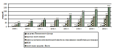 Рисунок 3 – Динамика поступлений средств ОМС в территориальные фонды ОМС в 1999-2006 гг. Представленная динамика поступлений средств обязательного медицинского страхования в территориальные фонды ОМС за 1999-2006 гг. отражает рост данных поступлений. Общая сумма в 2006 году составила 255,9 млрд. руб., в 2005 году – 225,6 млрд. руб., в 2004 году – 185,3 млрд. руб. Следовательно, в 2006 году увеличение поступлений по сравнению с 2005 годом произошло на 13,43%, по сравнению с 2004 годом – на 38,10 %. Данные цифры отражают эффективность проводимых реформ на территории Российской Федерации. Необходимо отметить, что в среднем по России в структуре поступлений средств ОМС в территориальные фонды основную долю средств составили налоговые поступления – 62,1% и страховые взносы на обязательное медицинское страхование неработающего населения – 30,4% (за 2005 год данные показатели составили 61,0% и 31,3%, соответственно). Территориальными фондами обязательного медицинского страхования в 2004 году было израсходовано средств на сумму 198,7 млрд. руб., в 2005 году – 219,3 млрд. руб., а в 2006 году – 243,8 млрд. руб. (рисунок 4).