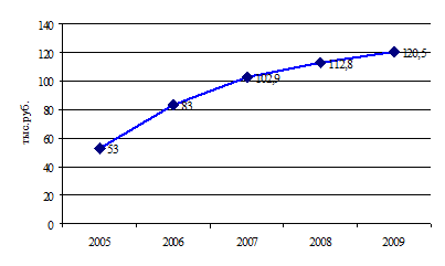 Рисунок 5 – Структура расходов средств ОМС территориальными фондами ОМС в 2006 году (процент к доходу ТФОМС) Основная часть средств ОМС территориальными фондами в 2006 году была израсходована на финансирование территориальной программы ОМС и составила 231,9 млрд. руб. (95,1% к доходам ТФОМС) (рисунок 5). Таким образом, сфера здравоохранения развивается достаточно эффективно в рамках приоритетного национального проекта "Здоровье". В I полугодии 2006 года поддерживался высокий уровень иммунизации населения, что позволило обеспечить снижение заболеваемости инфекциями, управляемыми средствами специфической профилактики. В январе-июне 2006 года по сравнению с аналогичным периодом 2005 года произошло снижение общего числа инфекционных заболеваний на 6%. Число заболевших вирусными гепатитами снизилось на 30,8%, эпидемическим паротитом – на 15,6%, дифтерией – на 41,9%. Заболеваемость вирусным гепатитом А уменьшилась на 39,4%. Несмотря на рост общего числа случаев заражения ВИЧ-инфекцией (в январе-июне 2006г. зарегистрировано 15,3 тыс. случаев ВИЧ-инфекции, что на 2,9% больше, чем соответствующий период 2005 года), проводимая работа по противодействию ее распространения позволила удержать эпидемию сконцентрированной, в основном, в уязвимых группах населения, сдержать массовый выход инфекции в общую популяцию населения. Реализация приоритетного национального проекта "Здоровье" началась с 1 января 2006 года. Данный проект внес определенные коррективы, касающиеся расходов бюджета по врачебной медицинской помощи (ВМП) на одного пролеченного больного. Если в 2005 году данный показатель составлял 53 тыс. руб., то в 2006 году он составил уже 83 тыс. руб. (рисунок 6)). В дальнейшем прогнозируется данный показатель на уровне 102,9 тыс. руб. в 2007 году, 112,8 тыс. руб. в 2008 году, 120,5 тыс. руб. в 2009 году.