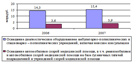 Рисунок 6 – Динамика роста расходов федерального бюджета по ВМП С 1 января 2006 года мероприятия Приоритетного национального проекта в сфере здравоохранения положили начало повышению качества услуг в сфере здравоохранения: - введен полицевой учет врачебных кадров первичного звена здравоохранения; - установлен поименный перечень лечебных учреждений, оказывающих амбулаторно-поликлиническую помощь; - приведены в соответствие с нормативами численности обслуживания населения врачебные участки; - осуществляются поставки медицинского оборудования в учреждения здравоохранения для приведения их оснащенности в соответствие с табелем (стандартом) оснащения; - разработаны единые стандарты оказания медицинской помощи в амбулаторно-поликлинических учреждениях, федеральных специализированных медицинских учреждениях. В 2007 году планируется дооснащение 6060 автомобилями скорой медицинской помощи, вездеходами, в т.ч. реанимобилями и реанимобилями с кювезом – 380 шт. Динамика затрат за приобретение специальных транспортных в 2006 году и планируемый объем в 2007 году представим на рисунке 7. Представленная на рисунке 7 динамика отражает планируемый в 2007 году рост как по показателю оснащения диагностическим оборудованием амбулаторно-поликлинических и стационарно-поликлинических учреждений, включая женские консультации, так и по показателю оснащения автомобилями скорой медицинской помощи, в т.ч. реанимобилями и автомобилями скорой медицинской помощи на базе гусеничных тягачей подразделений и учреждений скорой медицинской помощи.