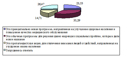 Рисунок 19 – Согласие респондентом с представленными суждениями о проекте "Здоровье" Исходя из данных представленных на рисунке 18, следует, что большинство респондентов (35,29%) считают проект обычной программой для решения давно назревших социальных проблем, которой дали новое название. 23,53% считают, что данный проект является принципиально новой программой, направленной на улучшение здоровья населения и повышение качества медицинского обслуживания. Итак, проведенное исследование выявляет недостатки в системе функционирования ОМС, которая непосредственным образом отражается на сфере здравоохранения муниципального образования "Нижнекамский муниципальный район" в целом. Основными проблемами в сфере здравоохранения являются безответственность медперсонала, платность услуг и запись к специалисту. Таким образом, гипотеза исследования подтвердилась, то есть независимо от источника финансирования медицинских услуг качество их предоставления не изменилось. 3. Пути совершенствования муниципального регулирования системы обязательного медицинского страхования