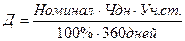 где Д – дисконт, руб.; Номинал – номинал векселя, руб.; Чдн – число дней от даты учета до платежа по векселю; Уч.ст. – учетная ставка банка, %. Чем больше номинальная стоимость векселя, тем большую сумму удержит банк в виде дисконта. Одновременно, чем меньше дней останется до срока платежа по векселю, тем меньший дисконт причитается банку. Например, оптовый клиент ООО ПЦ «ЖБИ-4» нуждается в срочной отгрузке продукции на сумму 420 тыс. рублей, но при этом не имеет возможности рассчитаться немедленно. Определим номинал векселя, который ему необходимо приобрести в банке, чтобы оплатить товар на 420 тыс. рублей. Пусть срок платежа по векселю – 15 дней, учетная ставка банка – 3%. Если он приобретет вексель на сумму 420 тыс. руб., то дисконт будет равен:
