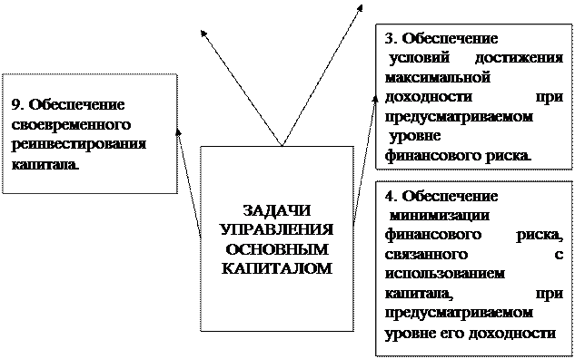 Рис. 1.1. - Основные задачи управления основным капиталом предприятия 1. Формирование достаточного объема основного капитала, обеспечивающего необходимые темпы экономического развития предприятия. Эта задача реализуется путем определения общей потребности в капитале для финансирования необходимых предприятию активов, формирования схем финансирования активов, разработки системы мероприятий по привлечению различных форм капитала из предусматриваемых источников. 2. Оптимизация распределения сформированного капитала по видам деятельности и направлениям использования. Эта задача реализуется путем исследования возможностей наиболее эффективного использования капитала в отдельных видах деятельности предприятия и хозяйственных операциях. 3. Обеспечение условий достижения максимальной доходности при предусматриваемом уровне финансового риска. Максимальная доходность (рентабельность) может быть обеспечена на стадии формирования капитала за счет минимизации средневзвешенной стоимости, оптимизации соотношения собственного и заемного капиталов, привлечения их в таких формах, которые в конкретных условиях хозяйственной деятельности предприятия генерируют наиболее высокий уровень прибыли. 4. Обеспечение минимизации финансового риска, связанного с использованием основного капитала, при предусматриваемом уровне его доходности. Если уровень доходности формируемого капитала задан или спланирован заранее, важной задачей является снижение уровня финансового риска операций, обеспечивающих достижение этой доходности. 5. Обеспечение постоянного финансового равновесия предприятия в процессе его развития. Такое равновесие характеризуется высоким уровнем финансовой устойчивости и платежеспособности предприятия на всех этапах его развития и обеспечивается формированием оптимальной структуры капитала и его авансированием в необходимых объемах в высоколиквидные виды активов. 6. Обеспечение достаточного уровня финансового контроля над предприятием со стороны его учредителей. Такой финансовый контроль обеспечивается контрольным пакетом акций (контрольной долей в паевом капитале) в руках первоначальных учредителей предприятия. 7. Обеспечение достаточной финансовой гибкости предприятия. Она характеризует способность предприятия быстро формировать необходимый объем капитала при неожиданном появлении высокоэффективных инвестиционных предложений или новых возможностях ускорения экономического роста. Необходимая финансовая гибкость обеспечивается в процессе формирования основного капитала за счет оптимизации соотношения собственных и заемных его видов, долгосрочных и краткосрочных форм его привлечения, снижения уровня финансовых рисков, своевременных расчетов с инвесторами и кредиторами. 8. Оптимизация оборота капитала. Эта задача решается путем эффективного управления потоками различных форм капитала в процессе отдельных циклов его кругооборота на предприятии. 9. Обеспечение своевременного реинвестирования капитала.В связи с изменением условий внешней экономической среды или внутренних параметров хозяйственной деятельности предприятия, ряд направлений и форм использования капитала могут не обеспечивать предусматриваемый уровень его доходности. В связи с этим важную роль приобретает свое