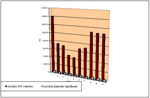 Источник: www. gks. ru - сайт Федеральной государственной службы статистики РФ На основе данной таблицы и Приложения 1 можно сказать, что на фоне снизившихся эмиграционных процессов иммиграция в России имеет тенденцию к сокращению. По сравнению с 2000 годом – годом иммиграционного пика, по данным на 2009 год, число иммигрировавших из других стран уменьшилось на 22,1% и в 2009 году составило 279907 чел., в том числе из стран СНГ и Балтии приехало 270594 чел., а из стран Дальнего Зарубежья – 9313 чел. Тенденция изменения данного показателя показана на рисунке 1.