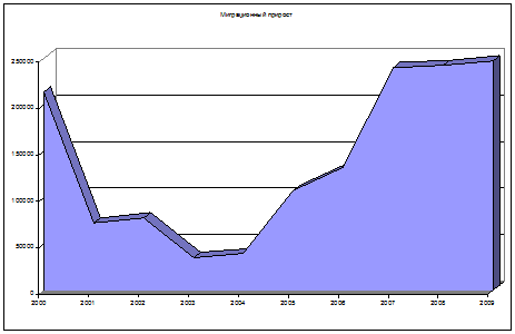 Рис. 1. Число прибывших в Россию в 2000-2009 гг. 2009 год стал годом упадка эмиграции россиян в другие страны. Если в 2000 году число эмигрантов составляло 145720 чел., то в 2009 году это число составило 32857 чел., т.е. на 22,65% данный показатель стал меньше. Таким образом, миграционный прирост в России составил 2477050 чел. (рис. 2). Следует отметить, что в среднем за 2000-2009 гг. показатель вырос на 1,63%.