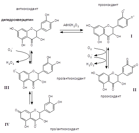 Флавоноиды легко и необратимо окисляются до п-гидрохиноновой формы, которая далее обратимо может окисляться до п-хинона. Последний легко полимеризуется в не растворимое соединение. Окисление флавоноидов катализируется ионами тяжелых металлов и под действием света. Промежуточные формы окисления флавноидов могут являться токсичными для клеток, а в процессе их взаимопревращения в ряде случаев образуются АФК (рис. 4).