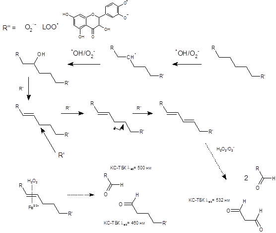 | Инкубация раствора липида при 37о С и pH 8 в присутствии ингибитора/катализатора ПОЛ и 10 мМ пероксида водорода | ||||||