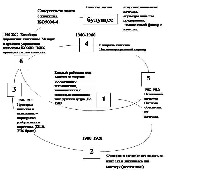 На первом этапе каждый работник сам отвечал за продукцию собственного изготовления. Второй этап условно затронул период с 1900-1920г. Сущность его заключалась в том, что основная ответственность за качество ложилось на мастера(десятника). В этот период проходило активное внедрение «системы Тейлора», которая включала такие понятия как верхний и нижний пределы качества, поля допусков, вводила измерительные инструменты (шаблоны и калибры). В ней обосновалась необходимость введения независимой должности инспектора по качеству, были разработаны метод воздействия на качество продукции, система штрафных санкций за брак. На этом этапе качество продукции определялось как соответствие стандартам. Третий этап эволюции управления качеством охватил период с 1920 по 1940. В этот период начали появляться обоснованные Тейлором инспекции по качеству . Начала осуществляться 100% инспекция готовой продукции. Контроль качества переходил в руки специально обученных независимых экспертов по качеству. Впервые стали применятся методы статистического контроля: контрольные карты, обосновывались выборочные методы контроля качества продукции. Заслуги в разработке контрольных карт принадлежат В.Шухорту (1891-1967). Его роль в истории качества связана также с разработкой современной философии качества. Качество определялось как соответствие стандартам и стабильности процессов. Проводился контроль готовой продукции. Четвертый этап с 1940 по 1960 получил целое название «Статистический контроль качества», т.к. именно в это время повсеместно распространились статистические методы контроля качества. Разработанные в США и не получившие там должного признания, они активно стали использоваться на японских предприятиях. Более того, после возведения проблем качества в ранг общегосударственной национальной программы при непосредственном участии К.Исикавы, изучением статистических методов начали заниматься в Японии со школьной доски. На предприятиях их изучали в кружках качества. Качество продукции, процессов, деятельности определялось как соответствие рыночным требованиям. Осуществлялся контроль проектирования и производства. Пятый этап охватил период с1960 по 1980. На этом этапе большой вклад в развитие управления качеством внесли Э.Деминг и Дж.Джурам. Им удалось убедить руководство японских компаний в важности обеспечения качества продукции. Они отводили особую роль в обеспечении качества продукции именно высшему руководству фирмы. Э.Демингом были сформулированы 14 принципов, которые были положены в основу реформирования системы менеджмента производства в Японии. Философия качества и методы его обеспечения, разработанные этими учеными, позже легли в основу теории Всеобщего управления качеством (TQM). В этот период американским специалистом по качеству А.Фейгенбаумом была разработана идея комплексного управления качеством, которая предусматривала учет всех факторов, влияющих на качество, управление качеством на всех этапах производства и между всеми подразделениями компании. В это время получила распространение концепция «Систем обеспечения качества», которая обеспечивала уже не только проектирование и изготовление качественной продукции, но и качество всей деятельности фирмы. Благодаря Деменгу, Джураму, Фейгенбауму, Исикаве и другим в Япони