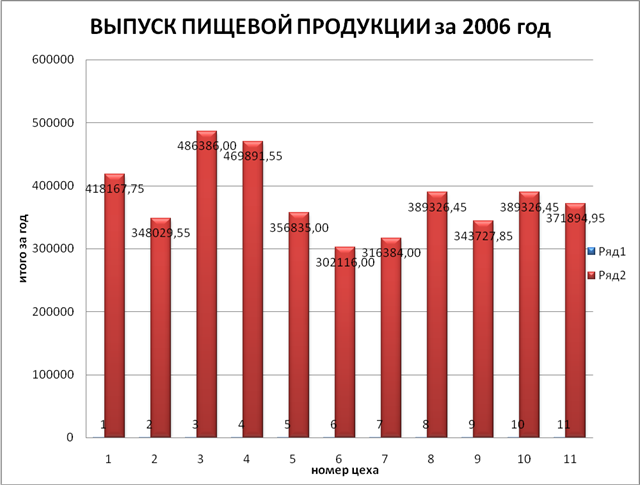 3.1. Описание работы шеф-повара. Шеф – повар столовой должен обладать следующими знаниями: -технологическое приготовление блюд; -составление калькуляции и ценообразования; - составление технологических карт; -знание всех участков кухни; - знание специфики нормативов и прочее. Шеф – повар столовой составляет технологические карты, проводит анализ себестоимости блюд, составляет план-меню, ведёт соответствующую документацию, а также уставную отчётность. Шеф – повар проводит обучение производственного персонала приготовлению блюд и ведёт контроль и координацию работы сотрудников кухни, а также контролирует соблюдение технологии приготовления блюд и выполнение меню. Шеф – повар столовой следит за соблюдением санитарных норм. 3.1.Создание таблицы в Microsoft Excel . Из стартового меню выбираем команду программы Microsoft Excel. Вначале определяем ширину столбцов: при помощи мыши перетаскиваем границы столбцов в нужную нам строку. Заполняем таблицу данными. Для этого вводим в соответствующие ячейки следующее: -А 1: ведомость выпуска пищевой продукции; -А 2: номенклатурный номер; -В 2: дата; -С 2: номер цеха; -С 4:1; D4:2; Е4:3; F4:4; G4:5; H4:6; I4:7; J4:8; K4:9; L4:10; M4:11; -N 2: всего по пищеблоку; - N 4: сумма; -O 4: процент; -В 17: итого. При помощи кнопки объединить и поместить в центре на панели форматирования, объединяем следующие группы ячеек: -А 1:О 1; -А 2:А 3: А 4; -В 2: В 3: В 4; -С 2: М 3; -N 2: O 3. Затем подаём команду ячейки из меню формат, выбираем вкладку выравнивание, устанавливаем флажок переносить по словам для следующих групп ячеек: -А 2: А 3: А 4; -N 2: O 3. Изменяем шрифт: команда ячейки, вкладка шрифт из меню формат; выбираем шрифт Calibri, размер шрифта-12. При помощи кнопки Ж (полужирный шрифт) с панели форматирования выделили надпись- ведомость выпуска пищевой продукции. Цвет шрифта - чёрный. Изменяем цвет фона в области - А1:Q4 следующим образом: выделяем левой кнопкой мыши данную группу ячеек, из вкладки вид меню формат выбираем команду ячейки, кнопка цвет заливки с панели форматирования. Выбираем серый цвет, нажимаем кнопку Оk. Выделяем области таблицы А1: Q17 и делаем настройку рамки при помощи кнопки границы на панели форматирования. Выбираем все границы, нажимаем левую кнопку мыши. Получаем оформленную таблицу. 3.2.Расчёт данных при помощи мастера функций Microsoft Excel Заполняем столбцы A,B,C,D,E,F,G,H,I,J,K,L,M произвольными данными. Подаём команду ячейки из меню формат, выбираем вкладку число, устанавливаем числовой формат, число десятичных знаков-2, нажимаем кнопку Ok. Рассчитываем суммы в столбце Р. Для этого выделим ячейки С5:О5 и нажимаем кнопку автосумма на панели стандартная и так далее по всем строкам. Рассчитываем суммы по столбцам C,D,E,F,G,H,I,J,K,L,M. Для этого ставим курсор в ячейку С 17, вводим формулу: С5+С6+С7+С8+С9+С10+С11+С12+С13+С14+С15+С16 и нажимаем клавишу Enter. Скопировали формулу на все столбцы, растянув ячейку С16 за правый нижний угол. Далее определяем процент выпуска пищевой продукции по пищеблоку. Для этого нажимаем правую кнопку мыши, выбираем формат ячеек, число, процентный, число десятичных знаков после запятой – 1, нажимаем Ok. Выделяем ячейку О5/N17, нажимаем Enter. Копируем формулу на весь столбец. Растёт данных таблицы произведён. 4.Создание диаграмм. 4.1.Создание гистограммы. Для создания гистограммы необходимы исходные данные. Для этого выделяем два столбца, нажимая клавишу Ctrl: - С 4: М17 – номер цеха; - С17: М17 – ито