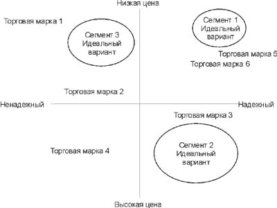 Рис.1 На рис. 1 шесть торговых марок были идентифицированы как конкурирующие. Два параметра были признаны покупателями наиболее важными для осуществления выбора между альтернативными марками (цена и надежность). Три рыночных сегмента требовали различных комбинаций цены/надежности (с первого сегмента по третий). Торговые марки 5 и 6 открыто соперничают друг с другом за объем продаж в первом сегменте. Обе торговые марки предлагают комбинацию надежности при низкой цене, требуемой сегментом. Сегмент третий, с другой стороны, предпочитает ненадежные товары, но опять же по низкой цене. Торговые марки 1 и 2 конкурируют в этом сегменте, но ни та ни другая не предлагают в действительности того, что сегмент считает идеальным (торговая марка 1 слишком ненадежна, а торговая марка 2 имеет недостаточно низкую цену). Торговая марка 3 предлагает сегменту 2 надежный товар по средней и высокой цене. В итоге торговая марка 4 не соответствует запросам ни одного сегмента, так как комбинация ненадежности и высокой цены никому не требуется. [1] Выбор и реализация стратегии позиционирования. Для некоторых компаний выбор стратегии позиционирования не составляет особого труда. Например, компания, хорошо известная в определенных сегментах рынка высоким качеством своих товаров или услуг, при проникновении в новый сегмент будет стремиться сохранить эту же позицию, если в этом сегменте достаточно много потребителей, ценящих высокое качество как дополнительное преимущество. Во многих случаях на одну и ту же позицию претендуют две или несколько фирм. В таком случае каждая из них будет стремиться найти свои способы выделить себя среди конкурентов, предлагая "высокое качество по низкой цене" или "высокое качество и более высокий уровень обслуживания". Каждая компания должна дифференцировать свое предложение, создавая уникальный набор взаимосвязанных конкурентных преимуществ, привлекательных с точки зрения представительной группы в рамках данного сегмента. Обычно потребители выбирают те товары и услуги, которые наиболее полно удовлетворяют их потребности. Поэтому, перед выбором стратегии позиционирования, маркетологи тщательно анализируют основные конкурентные преимущества своих товаров или услуг. Полноценное позиционирование конкретной торговой марки выражается в предложении ценности, т.е. целого ряда преимуществ товара или услуги, на основе которых и строится стратегия позиционирования. Таким образом, компания пытается дать исчерпывающий ответ на самый важный для потребителя вопрос "Почему я должен покупать товары вашей марки?" Рассмотрим пять выигрышных вариантов предложения ценности, которые компании могут использовать для позиционирования своих товаров: 1. Больше за больше Используя при позиционировании стратегию "Больше за больше", компания предлагает высококачественный товар или услугу по более высокой цене, чтобы покрыть более высокие издержки его производства. Такие товары свидетельствуют о высоком статусе потребителя и ассоциируются с представителями высшего общества. Зачастую разрыв в цене между товарами этой группы и аналогичными намного больше, чем разрыв в качестве. Однако следует учесть, что ценностное предложение "больше за больше" довольно таки рисковое позиционирование. Товары этой группы часто имитируются, при этом я