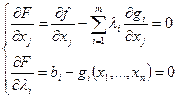 fi , gi – некоторые функции и переменные bi – некоторое фиксированное число Результатом решения задачи будет x=( x1 , x2 ,…, xn ) , координаты которой удовлетворяют данным соотношениям. Эти соотношения образуют системе ограничений и включают в себя условия неотрицательности переменных. В отличии от задачи линейного программирования, функция f может быть функцией степенной (квадратной, кубической и т.д.). Графический способ решения задачи линейного программирования: 1. Найти область допустимых решений задачи, используя систему ограничеий; 2. Построить график функций f ; 3. Определяют границы допустимых решений; 4. Находят точку области допустимых значений через которую проходит график функций f и определяют в ней значение функции. Метод множества Лагранжа Рассмотрим частный случай общей задачи нелинейного программирования. Предполагается, что система ограничений содержит только уравнения, отсутствуют условия неотрицательности переменных и функции f и gi непрерывные вместе со своими частными производными.