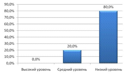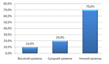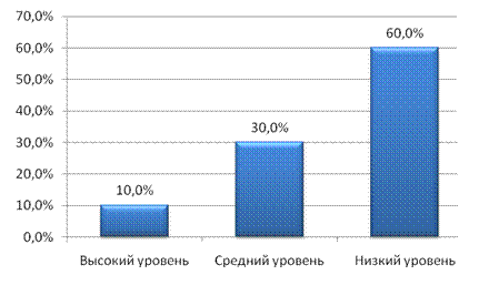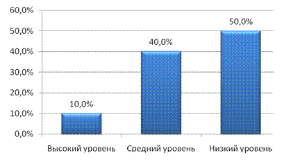Рис. 5. Успешность выполнения заданий детьми по методике «Нелепицы» Анализ полученных данных показал, что только у 10,0% детей с задержкой психического развитиявыполнение задания не вызвало затруднений. 40,0% детей с задержкой психического развитияпри интерпретации сюжетной картинки с конфликтным смыслом понимали «нелепости» ситуации не сразу, а после непродолжительного «раздумия вслух», то есть после включения в процесс анализа громкой речи, задавая вопросы и сами же на них и отвечая. Наконец, большая часть детей с задержкой психического развития(50,0% – низкий уровень) при интерпретации сюжетных картинок с конфликтным смыслом в большинстве случаев формально описывали сюжет, не анализируя условий задачи, представленной в наглядном плане. По окончании констатирующего эксперимента на основе полученных результатов были выделены следующие уровни развития наглядно-образного мышления детей с задержкой психического развития (рисунок 6).