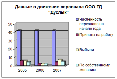 Из результатов расчетов определяем влияния факторов: - товарооборота: 571,64 – 554,4 = 17,24 тыс. рублей. - среднегодовой заработной платы: 619,28 – 571,64 = 47,64 тыс. рублей. - выработки: 557,7 – 619,28 = - 61,58 тыс. рублей. Итого: 17,24 + 47,64 – 61,58 = 3,3 тыс. рублей. Таким образом, в ООО «Фламинго» фонд заработной платы возрос на 17,24 тыс. рублей под влиянием роста товарооборота, на 47,64 тыс. рублей – под влиянием увеличения средней заработной платы и снизился на 61,58 тыс. рублей – под влиянием выработки. Наиболее ответственный этап в анализе обеспеченности организации трудовыми ресурсами – изучение их движения, данные и расчеты показателей для которого приведены в таблице 3.2.3. Таблица 3.2.3 Данные о движении персонала ООО «Фламинго» за 2003-2005гг.