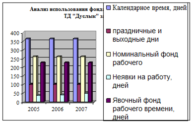 Рис.3.1.2. Данные о движении персонала ООО «Фламинго» за 2003-2005 гг. Полноту использования персонала можно оценить по количеству отработанных дней и часов одним работником за анализируемый период времени. Такой анализ проводится по каждой категории работников, по каждому производственному подразделению и в целом по предприятию. Рассмотрим зависимость фонда рабочего времени от численности рабочих, количества отработанных дней одним рабочим в среднем за год и средней продолжительности рабочего дня в таблице 3.2.4. Таблица 3.2.4 Показатели использования рабочего времени в ООО «Фламинго» за 2003 – 2005гг.