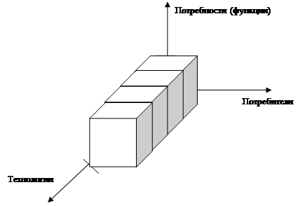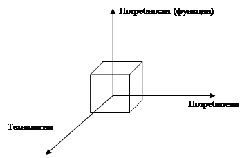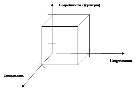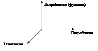 Рисунок 1 - Модель Д. Абеля Речь идет о потребностях, которым должны удовлетворить товар или услуга. Функции следует отделять от способов, которыми эта функция выполняется (т.е. от технологий). Потребитель – это тот, кого нужно удовлетворить (существующие потребители и потенциальные потребители). Наиболее часто используемыми критериями выделения различных групп потенциальных потребителей являются: семья или организация, социально-экономический класс, географическая зона, характер активности, размер или финансовые возможности фирмы, технологический уровень, изготовитель или потребитель конечного продукта, центр закупки и т.д. Технология – это способы выполнения функций (одна и та же функция выполняется разными технологиями; технология изменяется, базовые потребности остаются постоянными). Для определения технологий рассматриваются различные технологические «ноу-хау», обеспечивающие выполнение различных функций. Следует выделять следующие структуры базового рынка: 1. Рынок товара - находится на пересечении группы потребителей и набора функций, основанных на конкретной технологии. 2. Рынок решения - охватывает совокупность технологий для выполнения одной функции и для одной группы потребителей. 3. Отрасль - определяется технологией, независимо от связанных с ней функций или групп потребителей.