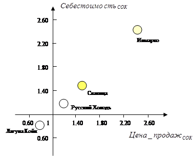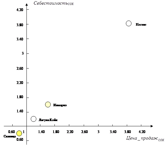 Рисунок 10 – Пространство конкурентных преимуществ по объему упаковки более 500 гр. Вывод: Цена и себестоимость продукции регионального производителя мороженого ООО «Славица» в упаковке объемом более 500 грамм оказалась средней по отношению остальным производителям. Наибольшее соотношение цена/себестоимость наблюдается у холдинга «Инмарко». ООО «НЕСТЛЕ Россия» не отражен на данном графике, т.к в данную категорию товара его продукция не попала. Наименьшее соотношение цена/себестоимость выявлено у продукции ООО «Лагуна Койл».