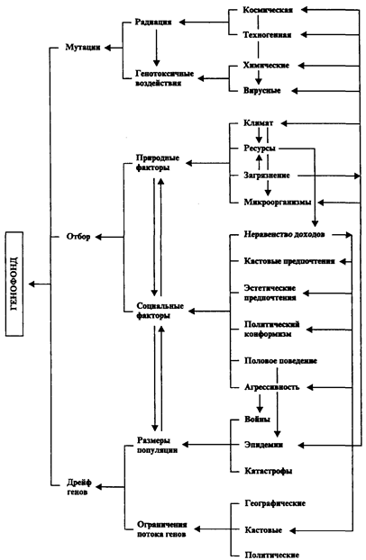 Рис. 2.4. Изменение генофонда (по [9]) Факторы мутагенеза. К ним из физических воздействий кроме ионизирующего излучения, возможно, относятся электромагнитные поля. Установлено, например, повышение заболеваемости лейкемией у лиц, проживающих длительное время вблизи высоковольтных линий электропередачи. Из сотен тысяч разнообразных химических соединений, поступающих в среду в виде бытовых и производственных загрязнений, около 20% генотоксичны. Мутационные изменения снижают жизнеспособность организма в 1-2-кратном соотношении со скоростью гаметного мутагенеза. Наряду с прямым канцерогенным эффектом - мутациями, нарушающими взаимодействие клеточных клонов в процессе их роста и трансформации, происходит нарушение контрольных функций гормональной и иммунной систем, на фоне которого возрастает риск злокачественных новообразований как хемотоксичной, так и вирусной этиологии. Дрейф генов. В прошлом дрейф генов был связан с резкими колебаниями численности локальных популяций, истребляемых войнами и эпидемиями. Выжившие основатели новой популяции передавали ей черты своей генетической индивидуальности. Утраченная часть генетического разнообразия восстанавливалась за счет повторных мутаций и потока генов, но определенные отличия могли сохраняться длительное время. Сегодня рост численности и более подвижный образ жизни предохраняют генофонд от дрейфа генов, разве что за исключением малочисленных популяций на океанических островах, в горных районах или тропических лесах. Естественный отбор. Внимание общественности и экспертов в первую очередь привлекают генотоксичные факторы прямого действия и связанные с ними заболевания, тогда как естественный отбор - в долгосрочном плане гораздо более мощный фактор изменения генофонда - остается в тени. Между тем любое воздействие на среду хотя бы в небольшой степени изменяет направленность отбора, создавая давление на популяцию и сдвигая частоты соответствующих генотипов. Угроза обеднения генофонда со временем становится все более реальной. Охрана среды обитания и системы здравоохранения - факторы, по существу, противостоящие естественному отбору в человеческих популяциях. Тем не менее отбор действует в особенности на пренатальном уровне (например, в виде ранних самопроизвольных абортов, которые могут остаться незамеченными). Любое заболевание снижает шансы на успешную карьеру, создание семьи и полноценный генетический вклад в следующее поколение. Поскольку люди неравноценны в отношении устойчивости к воздействиям специфического и общего характера, то отбор работает в пользу более устойчивых, невзирая на их личностные качества, и тем более активно, чем больше загрязнение среды. Эти процессы не только сокращают разнообразие людей, но и вымывают из популяции редкие гены, способствующие развитию социально ценных свойств, если они не сцеплены с генетическими факторами устойчивости к загрязнениям. Заключение Уровень воздействия человека на окружающую среду зависит в первую очередь от технической вооруженности общества. Она была крайне мала на начальных этапах развития человечества. Однако с развитием общества, ростом его производительных сил ситуация начинает меняться кардинальным образом. XXI век cвязан с качественно новым взаимоотношением науки, техники и техноло