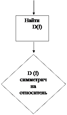 таково, что (-х) Примеры симметричных относительно нуля множеств: отрезок [-5;5]; интервал [-3;3]; числовая прямая (- Примеры несимметричных множеств: отрезок [-5;4]; интервал (-2;3); луч [-10;+ Несимметричным относительно нуля множеством является и промежуток [-2;2), так как –2 принадлежит этому множеству, а противоположное число 2 ему не принадлежит. Определение: Функция у = f(x) называется четной , если: 1) область определения D(f) есть множество, симметричное относительно нуля; 2) для любого х f(-x) = f(x) Таким образом, вопрос о четности или нечетности той или иной функции надо рассматривать, учитывая всякий раз не только вид аналитического выражения, но и тот промежуток, на котором определена данная функция. Ответ на вопрос: “Является ли, например, функция у = 1-х Например, на всей числовой прямой, или на отрезке [-1;1], то в этих случаях функция у = 1-х Заметим, что наряду с четными и нечетными функциями есть функции, не являющиеся ни теми, ни другими, например, такими являются функции у=1+sinx; у = 2 Итак, при исследовании функции у = f(x) на четность или нечетность, необходимо поступать следующим образом: а) выяснить симметричность области определения функции у = f(x) относительно нуля; б) если область определения функции не симметрична относительно нуля, то функция не является ни четной, ни нечетной; в) если область определения функции не симметрична относительно нуля, то необходимо проверить истинность равенств: f(-x) = f(x) (1) или f(-x) = f(x) (2) для всех х Если выполняется равенство (1), то функция у = f(x) четная; если выполняется равенство (2), то функция у = f(x) нечетная. Если не выполняется ни одно из равенств (1) или (2), то функция не является ни четной, ни нечетной. Можно предложить следующую блок-схему исследования функций на четность и нечетность: