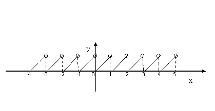 Функция y ={x} ({x} – дробная часть числа х) – периодическая. Заметим, что по определению Таким образом, функция у = {x} – периодическая с периодом Т, где Т Наименьшее целое положительное число равно единице. Следовательно, основной период данной функции Т = 1. Построим график функции у = {x}. Для этого сначала построим график функции на промежутке х Весь график функции у = {x} получим параллельным переносом графика функции у = {x}, где х