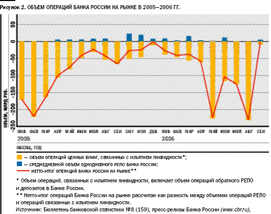 Попытки Банка России повысить национальные ставки до международного уровня и выше в условиях вновь обретенной открытости российской экономики неизбежно вызовут снижение спроса на кредит со стороны банков и одновременно стимулируют проведение ими спекулятивных операций, направленных на получение арбитражной премии, например заимствования на международном рынке и депонирование средств в Банке России. Действительно, предпринятое в 2006 г. Банком России повышение ставок по депозитам обернулось мощным притоком средств банков в этот инструмент, что объяснялось привлекательным уровнем процентных ставок, реальная величина которых повышалась еще и ожидаемым в будущем укреплением рубля (рис. 2). Сложилась ситуация, при которой Центральный банк фактически стал финансировать арбитражные операции банков: при сокращении объема операций по предоставлению ликвидности (объем РЕПО, ломбардных операций и операций своп был незначительным) у главного финансового учреждения существенно возросли расходы по обслуживанию депозитов кредитных организаций в Банке России. Помимо убыточности для Центрального банка, это чревато еще и дополнительной рублевой эмиссией.