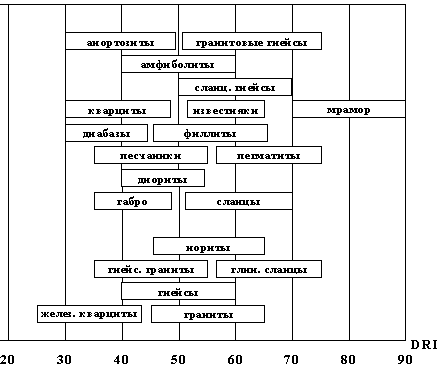 *Буримость горных пород в представленных выше диаграммах характеризуется Индексом Буримости (DRI). Данный индекс имеет широкое распространение в мировой практике горного производства. Индекс буримости для различных горных пород приведен на рис.3.