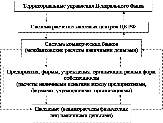 Рисунок 1 – Схема наличного денежного оборота (на примере России) [3, с. 76] Из схемы видно, что наличный денежный оборот начинается в расчетно-кассовых центрах Центрального банка РФ. Наличные деньги переводятся из их резервных фондов в оборотные кассы, тем самым они поступают в обращение. Из оборотных касс РКЦ наличные деньги направляются в операционные кассы коммерческих банков. Часть этих денег обслуживает межбанковские расчеты, часть – направляется в качестве кредитов другим банкам, но большая часть наличных денег выдается клиентам – юридическим и физическим лицам (либо в кассы предприятий и организаций, либо непосредственно населению), обслуживаемым в данном коммерческом банке. Часть наличных денег, находящихся в кассах предприятий и организаций, используется для расчетов между ними, но большая часть передается населению в виде различных видов денежных доходов (заработной платы, пенсий и пособий, стипендий, страховых возмещений, выплаты дивидендов, поступлений от продажи ценных бумаг и т.д.) Население также использует наличные деньги для взаиморасчетов, но большая их часть расходуется на выплату налогов, сборов, страховых платежей, квартплаты и коммунальных платежей, погашение ссуд, покупку товаров и оплату различных платных услуг, покупку ценных бумаг, арендные платежи, уплату штрафов, пени и неустоек и т.д. Таким образом, деньги поступают либо непосредственно в операционные кассы коммерческих банков, либо в кассы предприятий и организаций (прежде всего предприятий торговли и предприятий, оказывающих услуги населению). 1.2 Основы и принципы организации наличного денежного оборота Задача центрального банка при организации наличного денежного оборота — обеспечить его устойчивость, эластичность и экономичность. Поэтому оборот наличных денег служит объектом тщательного прогнозного планирования со стороны центрального банка и статистических органов. Управление наличным денежным оборотом осуществляется в централизованном порядке благодаря деятельности центрального банка и его подразделений. Для решения поставленной задачи центральным банком от кредитных институтов требуется соблюдение: - установленного порядка ведения кассовых операций; - правил организации поступления наличных денег в их кассы; - правил организации получения наличных денег из их касс; - лимита остатка их кассы (минимально допустимый остаток наличных денег в операционной кассе на конец дня); - порядка расчета наличными деньгами; - лимита расчета наличными деньгами (предельный размер между юридическими лицами). [1, с. 177] Организация денежного обращения во многом зависит от условий и порядка использования денег предприятиями, что регулируется специальными нормативными актами. [5, с. 29] Все организации, участвующие в хозяйственном обороте, должны хранить наличные деньги (за исключением части, установленной лимитом) в коммерческих банках. Кредитные институты (банки) имеют лимиты остатка наличных денег для организаций всех форм собственности. Наличные деньги организации могут получать только в обслуживающих их учреждениях банков. Целевое использование наличных денежных средств участниками наличного денежного оборота остается определяющим принципом организации наличного денежного оборота. Соблюдение клиентами этого принципа находит от