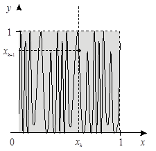 Можно показать, что для шара единичного радиуса при увеличении размерности n объем стремится к нулю. Наиболее просто это можно объяснить тем, что числитель растет со скоростью степенной функции, а знаменатель – с факториальной. Таким образом, для больших n метод вычисления через случайные числа будет давать значительные погрешности. 4. Генерирование равномерно распределенных случайных чисел Почти повсеместно используемый метод генерирования псевдослучайных целых чисел состоит в выборе некоторой функции f , отображающей множество целых чисел в себя. Выбирается какое-нибудь начальное число х 0 , а каждое следующее число порождается с помощью рекуррентного соотношения: xk +1 = f( xk ) Число xk часто называется зерном (англ. seed) ГСЧ и полностью определяет текущее состояние ГСЧ и следующее генерируемое значение. Поначалу функции f выбирались как можно более сложные и трудно понимаемые. Например, f (x ) определялась как целое число, двоичное представление которого составляет средний 31 разряд 62‑разрядного квадрата числа x (модификация метода средин квадратов). Но отсутствие теории относительно f приводило к катастрофическим последствиям. Для метода средин квадратов это уже упоминавшееся зацикливание при обращении очередного числа в нуль. Поэтому уже довольно давно перешли к использованию функций, свойства которых вполне известны. Всякая последовательность целых чисел из интервала (0, 231 –1) должна содержать повторения самое большое после 231 ≈109 элементов. Используя теорию чисел, можно выбрать такую функцию f , для которой наперед будет известно, что ее период максимально возможный или близкий к максимальному. Этим избегается преждевременное окончание или зацикливание последовательности. Дальнейшее использование теории чисел может более или менее предсказать характер последовательности, давая пользователю некоторую степень уверенности в том, что она будет достаточно хорошо моделировать случайную последовательность чисел. Представим генерирование чисел в диапазоне [0; 1] рекуррентым методом графически (см. рис. 1). Очевидно, функция f (x ) должна быть определена на всем отрезке [0; 1] и иметь на этом отрезке непрерывную область значений [0; 1], в противном случае генерируемые числа будут составлять лишь несобственное подмножество указанного отрезка.