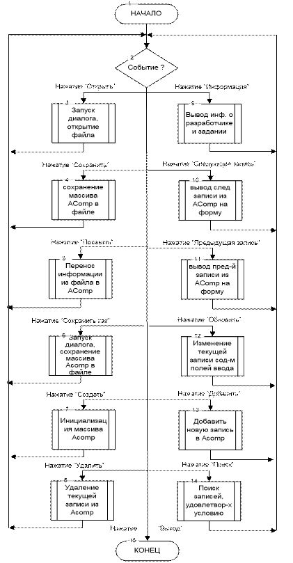 Рисунок 2.2 – Экранная форма приложения Для удобства работы в программе целесообразно всю информацию из файла хранить в динамическом массиве с элементами типа запись и оперировать с элементами массива. Словесный алгоритм действий при открытии файла: 1. Открыть файл для чтения. 2. Принять размерность массива равной нулю. 3. Считать очередную запись из файла. 4. Если достигнут конец файла, перейти на пункт 8. 5. Увеличить длину динамического массива на единицу. 6. Занести очередную запись, считанную из файла в конец массива. 7. Перейти на пункт 3. 8. Закрыть файл. 9. Отобразить содержимое массива в таблице на экранной форме. 10. Конец Словесный алгоритм действий при сохранении файла: 1. Открыть требуемый файл для записи. 2. Установить <номер> на начало массива (номер равен нулю). 3. Если достигнут конец массива, перейти на пункт 6. 4. Сохранить очередной элемент массива под номером <номер> в конец файла. 5. Нарастить <номер> на 1 и перейти на пункт 3. 6. Закрыть файл. 7. Конец. При поиске все записи, удовлетворяющие критерию выбираются в отдельный массив и отображаются на экранной форме. Словесный алгоритм действий при поиске: 1. Установить <номер1> на начало исходного массива А. 2. Обнулить размерность результирующего массива В. 3. Если достигнут конец массива А, перейти на пункт 8. 4. Если запись <номер1> исходного массива А удовлетворяет критериям поиска, перейти на пункт 4, если не удовлетворяет, перейти на пункт 7. 5. Нарастить длину результирующего массива В на единицу. 6. Записать элемент <номер1> массива А в конец результирующего массива В. 7. Нарастить <номер1> на единицу и перейти на пункт 3. 8. Отобразить содержимое массива В в таблице на экранной форме. 9. Конец. Анализируя требования к функциям разрабатываемого приложения под разработанную экранную форму можно выделить следующие программные модули: 1) вывод информации о разработчике программы и задании на курсовой проект; 2) создание нового типизированного файла, с информацией о компьютерах (инициализация временного массива записей ); 3) сохранение содержимого файла в типизированном файле на жестком диске; 4) сохранение содержимого файла в типизированном файле на жестком диске под новым именем; 5) вывод информации о компьютере текущей записи массива в поля ввода на экранной форме; 6) перенос информации из типизированного файла в динамический массив и вывод содержимого на форме; 7) продвижение к следующей записи в массиве; 8) продвижение на предыдущую запись массива; 9) перенос информации из полей ввода в поля текущей записи из массива; 10) добавление новой записи в массив; 11) удаление текущей записи из массива; 12) поиск записей по какому-либо критерию и вывод результатов на экранную форму; 13) вывод содержимого динамического массива на объекте типа TStringGrid. Каждый из вышеприведенных модулей реализуем при помощи процедуры. Модули 1,2, 3, 4, 6 будут обработчиками нажатий на соответствующие пункты главного меню. Для запуска модулей 7, 8, 9, 10, 11, 12 предусмотрим экранные кнопки на форме, для чего поместим на форму объекты типа TBitButton. А сами процедуры будут реализованы как обработчики нажатия на соответствующие кнопки. Модули 5, 13 реализуем как отдельную процедуру. Cоставим алгоритм приложения, который представлен в приложении на рисунке A.1. На алгоритме приведены основные события экранной формы. В этом алгоритме: блок №3 реализ