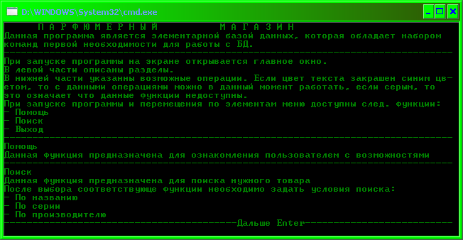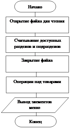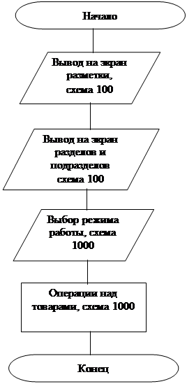 Схема 16 – Отчет по товарам Приложение 6 Листинг программы program parfum; uses crt; type {Список в котором содержатся код товаров} integ=^int; int=record nomer:integer; {Код товара} next:integ; {Ссылка на следующий элемент} end; var Nach:integ; {Начало списка} tek:integ; {Текущий элемент списка} d:integ; {Переменная для работы со списком} i:integer; {Счетчик} ch:char; {Ввод с клавиатуры} Rozd:string; {Выбранный раздел} nabor:integer; {Счетчик числа элементов меню} men:array[1..16] of integer;{Массив вывода элементы Главного меню} strok, stolb:integer;{Пункты меню} lom:integer; {Переменная для работы с Главным меню} vof:boolean; {Переменная указывает что массив цветов уже заполнен} Razdel:integer;{Переменная которая указывает открытую главу} PodRazd:integer; {Переменная которая указывает открыт подраздел} MRazdel:integer; {Переменная которая указывает открыт раздел} stek:text;{Файл в который добавляется код товара} {KodStek:integer;} ScetRP:integer; {Счетчик позиций в указанном разделе и подразделе} hod:integer; {Ходы вверх вниз в списке} kolvo:integer; {Количество элементов в списке} Text1,Text2,Text3,Text4:string[19]; {Комментарии} f:text; {Файловая переменная} f1,f2,f3,f4,f8,pd,pu,f10:integer; {Цвета пунктов внизу экрана} Prin:boolean;{логическая переменная для печать текущей позиции} Baza:record {Переменные для работы с файлами} Fsim:string; {Символ-разделитель} FKod:integer; {Код товара} FRazdel:integer; {Раздел} FPodRazdel:integer; {Подраздел} FName:String; {Название} FSeria:string; {Серия} FProizvod:string; {Производитель} FOpisan:string; {Описание товара} FMany:string; {Цена} end; procedure shapka; {Выводит разметку на экран, а именно горизонтальные и вертикальные линии и кнопки управления внизу экрана, а так же заголовок раздела и подраздела} var MainName:string; {Название подраздела} begin GoToXY(30,1); Textcolor(14); GoToXY(1,2); Textcolor(11); For i:=1 to 80 do write('-'); for i:=3 to 21 do begin GoToXY(20,i); Textcolor(11); writeln('|'); end; GoToXY(1,22); For i:=1 to 80 do write('-'); GoToXY(1,23); Textcolor(F1); writeln('Помощь F1|'); GoToXY(11,23); Textcolor(F2); writeln('Новый F2|'); GoToXY(20,23); Textcolor(f3); writeln('Поиск F3|'); GoToXY(29,23); Textcolor(f4); writeln('Отчет F4|'); GoToXY(38,23); Textcolor(f8); writeln('Удалить F8|'); GoToXY(49,23); Textcolor(pu); writeln('Назад PUp|'); GoToXY(59,23); Textcolor(pd); writeln('Далее PDown|'); GoToXY(71,23); Textcolor(f10); writeln('Выход F10'); GoToXY(1,24); For i:=1 to 80 do write('-'); GoToXY(1,17); Textcolor(11); writeln('-------------------'); if rozd='0'Then MainName:='ПАРФЮМЕРНЫЙ МАГАЗИН'; if rozd='1'Then MainName:='УХОД ЗА ЛИЦОМ'; if rozd='2'Then MainName:='УХОД ЗА КОЖЕЙ'; if rozd='3'Then MainName:='ДЕТСКИЕ ТОВАРЫ'; if rozd='4'Then MainName:='МАНИКЮР'; if rozd='5'Then MainName:='ПАРФЮМЕРИЯ'; if rozd='6'Then MainName:='УХОД ЗА ТЕЛОМ'; if rozd='7'Then MainName:='ТОВАРЫ ДЛЯ МУЖЧИН'; if rozd='8'Then MainName:='УХОД ЗА ВОЛОСАМИ'; if rozd='9'Then MainName:='ДРУГИЕ ТОВАРЫ'; GoToXY(30,1); Textcolor(13);writeln(MainName); GoToXY(1,18); Textcolor(12); writeln(Text1); GoToXY(1,19); Textcolor(12); writeln(Text2); GoToXY(1,20); Textcolor(12); writeln(Text3); GoToXY(1,21); Textcolor(12); writeln(Text4); end; procedure podRazdel; {Считывает из файла разделы и подразделы в зависимости от выбранного и выводит на экран} var PodRaz:array[1..16] of string;{Массив разделов и под разделов} z:integer; {Строка с которой начинается вывод пунктов меню} f:text; {Файловая переменная} d:string; {Переменная которой присваивается очередное считанное значение из файла} begin assign (f,'e:\prog\razdel.dat'); {Файл который содержит разделы и подразделы} reset(f); nabor:=0; while not Eof(f) do {До тех пор пока не конец файла делать если очередная строка файла соответствует выбранному разделу то записать ее в массив} begin Readln(f,d); if d=rozd then begin nabor:=nabor+1; Readln(f,d); PodRaz[nabor]:=d; end else Readln(f,d); end; close(f); {Вывод на экран пунктов и подпунктов меню из массива, закрашенных цветами из массива цветов} z:=3; for i:=1 to nabor do begin Textcolor(men[i]); GoToXY(2,z); writeln(PodRaz[i]); z:=z+1 end; end; procedure ADDSpisok;{Добавляет в динамический список код товара, для дальнейшего перемещения} begin new(tek); {создаем новый элемент} tek^.nomer:=Baza.FKod;{записываем данное} tek^.next:=nach;{устанавлива