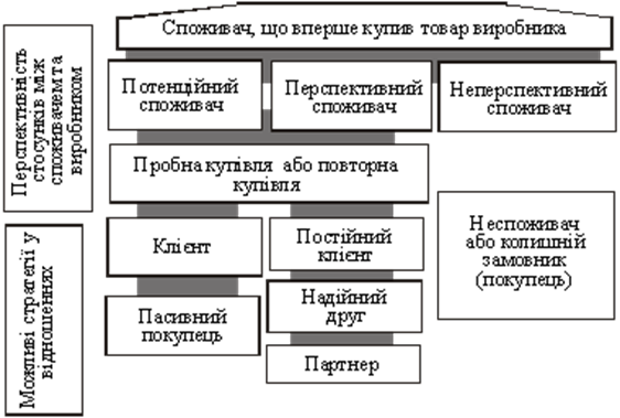 Рис. 1.1. Модель поведінки покупця На цій схемі видно, що маркетингові та інші стимули потрапляють до «чорної скриньки» споживача й породжують певну реакцію. На поведінку споживача впливають психологічні, особистісні, соціокультурні фактори, фактори ситуаційного впливу, а також комплекс маркетингу фірми-виробника певного товару. Фахівці з ринкових відносин та ринкової економіки сприймають людей як споживачів та покупців, а рекламодавці розглядають людей як цільову аудиторію для свого послання про товар та про себе. При цьому рекламодавці описують зазначену аудиторію в поняттях демографії та психографії. Демографічні характеристики споживачів охоплюють інформацію про кількість населення, вік, освіту, склад сім’ї, дохід тощо. До психографічних характеристик споживача належить інформація про соціальні відносини, життєвий стиль, споживчу поведінку та процес прийняття рішень. Усе це зрештою дає змогу визначати менталітет народу окремої країни та розробляти прийоми, які має застосовувати реклама в кожному конкретному випадку для створення максимально можливої сприятливої ситуації щодо рекламної діяльності рекламодавця. Необхідно враховувати індивідуальні особливості кожної групи потенційних споживачів, як її представники дивляться на життя, сприймають та інтерпретують навколишні події, як у цій групі формуються основи світосприйняття. Загальна модель поведінки споживачів містить такі складові: зовнішній вплив маркетингу підприємства-виробника або торгового посередника та соціально-культурних факторів; процес прийняття рішення споживачем залежно від психологічних факторів, оцінної моделі поведінки споживача та досвіду використання або застосування певного товару ринку, а також вчинки споживача (купівля, оцінка та подальші дії – повторна купівля, відмова від купівлі або рішення тимчасово утриматися від неї). Для того щоб споживач визначився стосовно своїх дій, він має чітко усвідомити ті фактори, які на нього впливають і визначають цінність даного товару або певної марки товару. Цінність, яку відчуває споживач, має два аспекти: загальну цінність для споживача та загальні витрати споживача, які асоціюються з купівлею даного товару або певної торгової марки товару. Загальна цінність для споживача – це цінність самого товару, послуг, торгового персоналу та персоналу, що проводить післяпродажне обслуговування, а також значною мірою сюди належить цінність іміджу товару, торгової марки товару та самого виробника і його торгового посередника. До загальних витрат споживача відносять грошові витрати на придбання товару, витрати часу на його транспортування, ходіння місцями продажу тощо, витрати енергії при використанні і, звичайно, емоційні витрати, пов’язані з покупкою, користуванням та ваганнями щодо правильності зробленого вибору. Уся складність моделі поведінки споживача зумовлює потребу ретельного дослідження процесу прийняття рішення споживачем, визначення вузлових моментів та економічного обґрунтування ефективності чи неефективності споживача як вигідного клієнта. У процесі купівлі споживач проходить через різні стадії: від поінформованості (наявність потреби в товарі), знання (про товар, що задовольняє цю потребу), симпатії та переваги (щодо певних марок) до переконання (стосовно того, що тіл