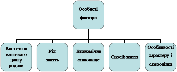 Рисунок 1.4. Соціальні фактори впливу на поведінку споживачів Крім культурних на споживче поводження впливають такі соціальні фактори, як референтні групи, родина, ролі і статуси. (рис. 1.4) Референтні групи Референтні групи – групи, що роблять (при особистому контакті) прямий чи непрямий вплив на відношення людини до чого(кому) – або і його поводження. Групи, що роблять прямий вплив на людину, називаються групами членства. Групи членства можуть бути первинними (родина, друзі, сусіди, усі ті спільності, взаємодія з членами яких носить постійний і неформальний характер) і вторинними групами (професійні колективи, релігійні і профспілкові об'єднання, побудовані скоріше на формальній основі, спілкування з членами яких носить періодичний характер). Референтні групи впливають на індивіда принаймні в трьох напрямках: вони можуть підштовхнути людини до зміни свого поводження і стилю життя; впливають на відношення індивіда до життя і його представлення пр самому себе; можуть впливати на вибір індивідом конкретних товарів і торгових марок. Родина – найважливіше соціальне об'єднання споживачів-покупців. Члени родини складають саму впливову першорядну референтну групу. Розрізняють два типи родин: що наставляє і породжена. Родина, що наставляє, складається з батьків індивіда і його родичів. У ній він одержує релігійні наставляння, тут визначаються його життєві цілі, почуття самоцінності і любові, у ній формується його позиція по політичних і економічних проблемах. У той же час вплив родини, що наставляє, носить непрямий характер. Прямий вплив на поводження покупця робить його породжена родина – дружин(а) і діти. Маркетологу необхідно визначити, хто з членів родини впливає на інших при виборі товару. Звичайно це один з чоловіків, що володіє великим авторитетом у родині або добре розбирається в предметі покупки. Ролі і статуси Людина протягом усього свого життя належить до декількох груп – родині, друзям, різним організаціям. Його позиції в кожній групі визначаються роллю, що виконується, і статусом. Роль – це набір дій, виконання яких очікують від людини навколишні його обличчя. Кожної ролі, що виконується, відповідає визначених статус. Звичайно люди купують товари, що повинні підтримувати і зміцнювати їхній соціальний статус. Дуже важливо, щоб маркетолог усвідомлював потенційну можливість перетворення продукту і марки в символи статусу. 1.2.3 Особистісні фактори На рішенння покупця впливають його особистісні характеристики: вік і етапи життєвого циклу родини, робота, економічне становище, спосіб життя, особливості характеру і самооцінка. (рис. 1.5) Вік і етапи життєвого циклу родини