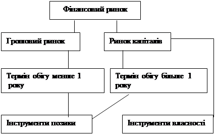 Рис. № 1.6. Класифікація фінансових ринків за терміном обігу фінансових активів. На ринку грошейздійснюється короткострокове інвестування коштів. На цьому ринку перебувають в обігу фінансові активи, термін обігу яких не перевищує одного року: короткострокові казначейські зобов'язання, ощадні та депозитні сертифікати, векселі, різні види короткострокових облігацій тощо. На ринку грошей корпорації залучають кошти для підтримки обігового капіталу в разі виникнення тимчасових короткострокових потреб у грошових коштах. Фінансові інститути, зокрема комерційні банки, залучають кошти на такому ринку для надання позичок іншим суб'єктам ринку та для підтримки ліквідності на належному рівні. Короткострокові цінні папери на ринку грошей більш ліквідні і характеризуються меншим коливанням цін, ніж на ринку капіталів, тому здійснення інвестицій на грошовому ринку менш ризикове, ніж на ринку капіталів. Ринок капіталівпризначений для довгострокового інвестування коштів в основний капітал. На ринку капіталів надаються середньо-та довгострокові кредити, перебувають в обігу середньо- та довгострокові боргові цінні папери, а також інструменти власності — акції, для яких термін обігу не встановлюється. Емітуючи акції та облігації, залучаючи банківські кредити, корпорації формують на ринку капіталів фінансові ресурси, необхідні для модернізації і розширення виробництва, впровадження нових технологій, освоєння виробництва нових видів продукції. Фізичні особи та будівельні організації залучають кошти для придбання та будівництва нерухомості. Фінансові інститути формують власні фінансові ресурси, які перебувають у їх використанні протягом усього періоду функціонування і забезпечують економічне зростання та економічну стабільність фінансовому інституту. В цілому на ринку довгострокових запозичень держава, підприємницькі структури і населення отримують за визначену плату в довгострокове або безстрокове користування фінансові ресурси інших учасників ринку. Ринок капіталів розвивається більшою мірою в країнах з досить визначеними та сприятливими економічними перспективами. Становлення ринку капіталів передбачає невисокі темпи інфляції, а також стабільність політичної та економічної ситуації в країні. 3. Залежно від місця, де відбувається торгівля фінансовими активами, розрізняють біржовий та позабіржовий ринки. Біржовий ринок пов'язують із поняттям біржі як особливий спосіб організованого ринку, що сприяє збільшенню мобільності капіталу та виявленню реальних ринкових цін активів. Біржовий ринок є переважно вторинним ринком, оскільки на ньому в більшості випадків відбувається торгівля емітованими раніше фінансовими активами. На позабіржовому ринку діють так звані торгово-інформаційні системи. Учасниками таких систем є фінансові посередники, які мають змогу ознайомитись з попитом-пропозицією на фінансові активи та укласти угоди з тими посередниками, пропозиції яких їх зацікавлять. На різних сегментах фінансового ринку біржовий та позабіржовий ринки відіграють різну роль. Так, на валютному ринку торгівля валютними ресурсами переважно зосереджується на позабіржовому міжбанківському ринку. На ринку цінних паперів як біржовий, так і позабіржовий ринки мають велике значення. Організаторами торгівлі на біржов