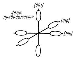 Изоэнергетические поверхности около абсолютных минимумов представляют собой эллипсоиды вращения относительно большой полуоси, которая совпадает с направлением [100] (Рис.4) Рис.4. Поверхности равной энергии в зоне проводимости кремния.