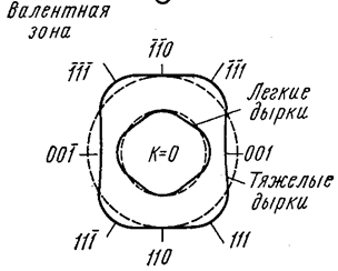 Следовательно, у кремния все 6 эллипсоидов изоэнергетической поверхности зоны проводимости можно заменить одной сферической поверхностью с эффективной массой плотности состояний для электронов, равной 1,08m0 . Для валентной зоны максимум энергии находится в центре зоны Бриллюэна к=0 для всех трех полос, при этом в этой точке все три зоны смыкаются, так что энергия в центре зоны Бриллюэна оказывается вырожденной(Рис.5). Рис.5. Поверхности равной энергии в валентной зоне кремния.