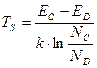 С ростом температуры уровень Ферми опускается. Концентрация электронов для этого случая: n=ND , т.е. концентрация электронов не зависит от температуры и равна концентрации примеси. Эта область температур носит название области истощения примеси. Переход от области примесной проводимости к области истощения происходит при температуре насыщения Ts . Ts — температура, при которой F=ED , ее можно определить из условия