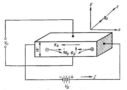 Внешнее поле Ex приложено вдоль оси x. Перпендикулярно ему (вдоль оси z) направлено магнитное поле Bz , а с верхнего и нижнего контактов снимается так называемое холловское напряжение VH . Для определенности будем считать образец дырочным (p-типа). Сила Лоренца qvx * B 2 отклоняет дырки к нижней поверхности образца, где они частично накапливаются, что приводит к возникновению вертикального электрического поля Eу — холловского поля, которое компенсирует действие силы Лоренца на дырки и обеспечивает равенство нулю вертикального тока J у . Холловское поле пропорционально плотности продольного тока Jx и напряженности магнитного поля Bz . Его величину находят, измеряя холловское напряжение VH : Ey =Vy /W=RH Jx Bz , где RH —коэффициент Холла, определяемый выражениями