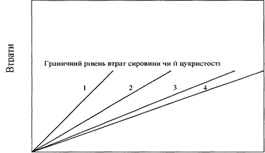 Дні зберігання сировини в кагаті Рис.3.2.2. Залежність втрат сировини чи її цукристості від днів її зберігання для чотирьох значень її якості 1< 2< 3< 4 В наведеній таблиці після закінчення подачі сировини на переробку проводиться підсумок втрат сировини та її цукристості, і визначаються причини відхилень їх від нормативних значень. По даних табл.3.2.1 і 3.2.2 проводиться формування зведеної поточної документації (відомості, які наведені в другому розділі). При передачі сировини в переробку (в другу підсистему) проходить визначення фактичних втрат сировини і її цукристості, тому необхідно на виробництві проводити їх списання по акту "Про передачу буряків у переробку." Загальну блок-схему ведення оперативного обліку й аналізу витрат в першій підсистемі можна подати у вигляді, який наведено на рис.3.2.4. Друга підсистема оперативного обліку й аналізу витрат охоплює технологічний цикл виробництва цукру із сировини. Такий цикл є найбільш трудомістким і характеризується найбільшими потенційними втратами цукру.