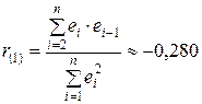 статистическая гипотеза об отсутствии автокорреляции в остатках не отклоняется на уровне значимости a=0,05. Проверим отсутствие автокорреляции в остатках также и по коэффициенту автокорреляции остатков первого порядка